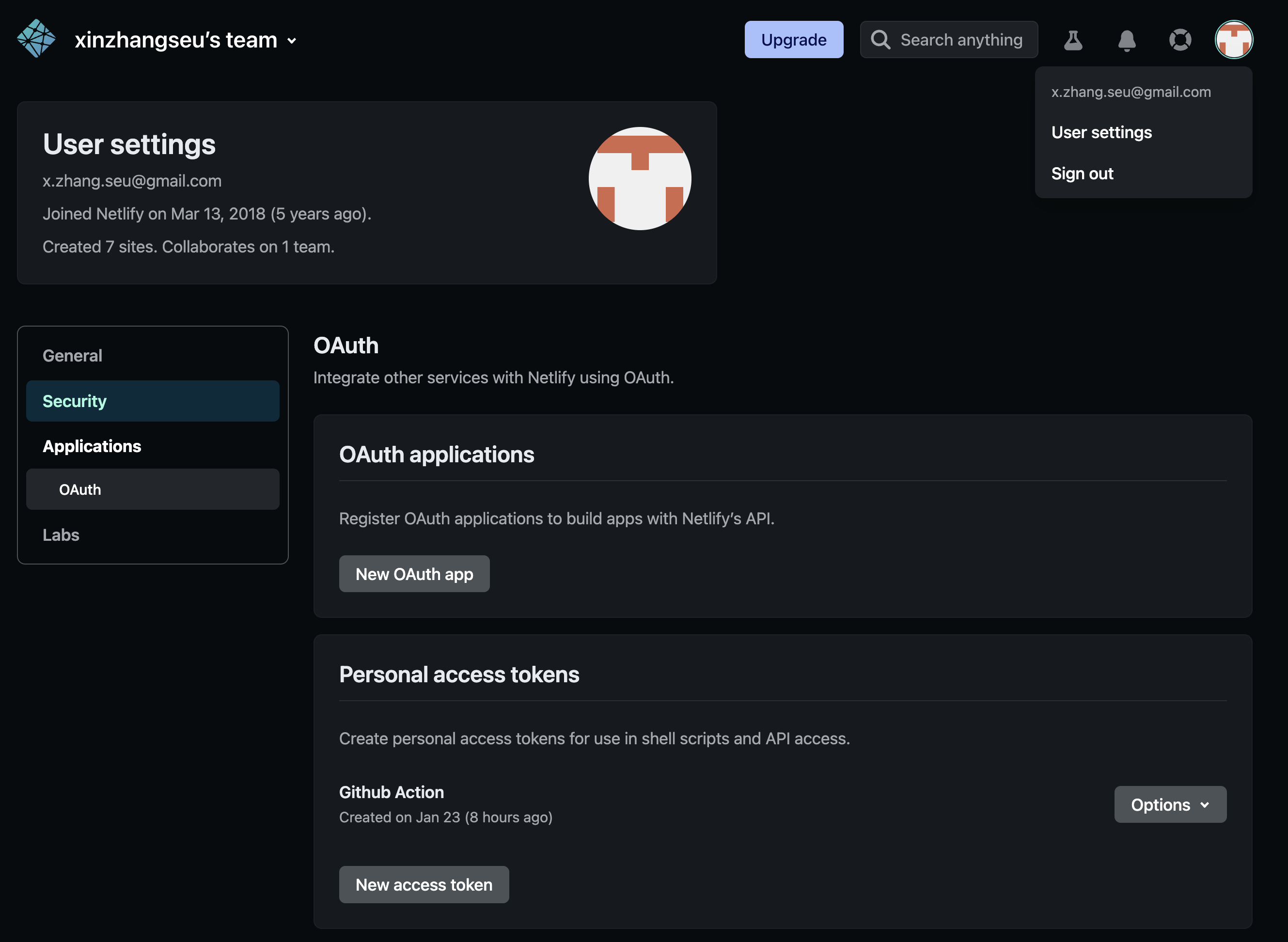 第一个是 NETLIFY_AUTH_TOKEN,在 Netlify 页面右上角点击 User settings > Applications > Personal access tokens 中点击 New access token,创建之后先不要关闭这个页面,等下要复制粘贴。