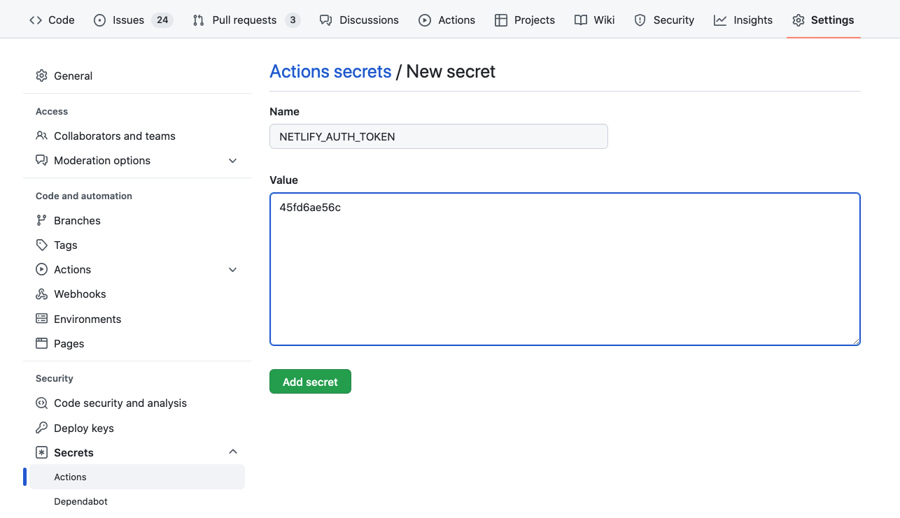 NETLIFY_AUTH_TOKEN和NETLIFY_SITE_ID - 设置 GitHub Repositories secrets