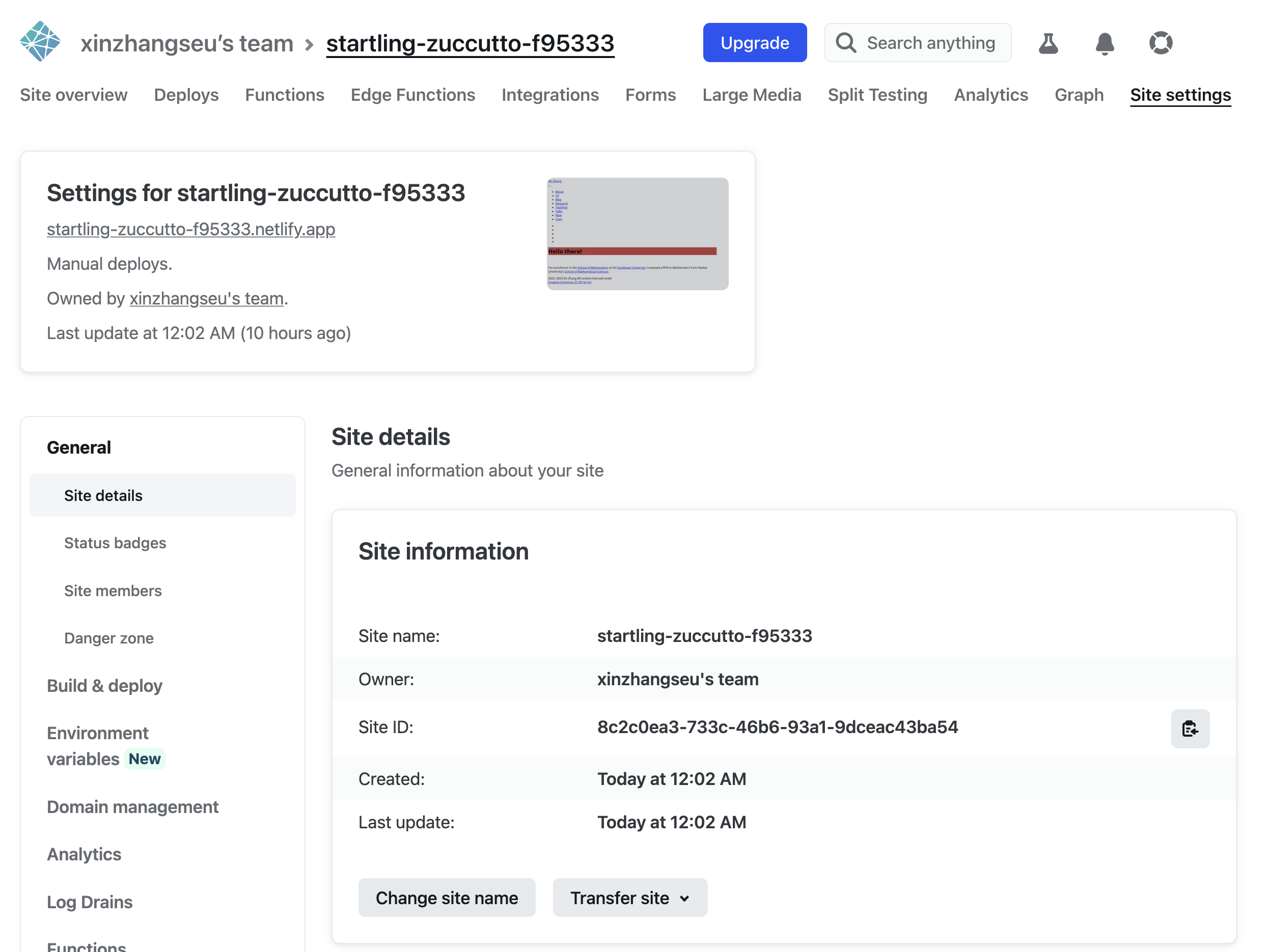 注意,系统自动生成的 Site name 较长,可以点击上图中的 Change site name 自行设置喜欢的 Site name。